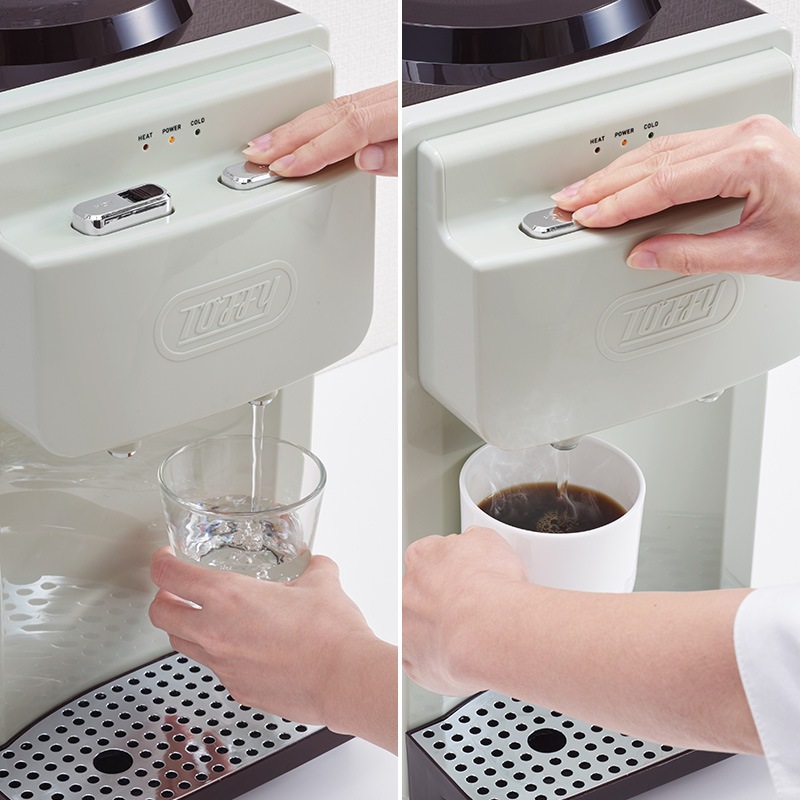 | 特徴 | ・手軽に使える温冷ウォーターサーバー 市販の2Lペットボトルをセットして使用できる、卓上サイズのウォーターサーバーです。組み立てや設定不要で、2Lペットボトルさえあればすぐにお使いいただけます。 ・カンタン設置ですぐに使える 組み立てや面倒な設定は不要です。専用キャップを使って本体にボトルを設置し、電源を入れて待つだけで温水と冷水がすぐに出ます。 ・ホコリ防止キャップが付属 ボトルにセットするキャップは口径サイズに合わせ、「Φ25mm用」と「Φ28mm用」の2種類が付属しています。キャップにはホコリ混入防止機能が付いているので、安心してお使いいただけます。※一部対応していない2Lペットボトルもあります。 ・冷水もお湯もラクラク 冷水は約10~15℃で飲料用として、温水は約85~95℃でコーヒーやお茶用にお使いいただけます。 ・運転状況をライトでお知らせ 3色のライトで運転状況を簡単に把握できます。 ・温水ボタンは安全ロック付き お湯はロックを解除してボタンを押さないと給湯されないので、お子さまがいるご家庭でも安心してお使いいただけます。 ・キッチンを彩るおしゃれなデザイン 幅広い空間にマッチする、レトロ感のあるシンプルなデザイン。おしゃれなボックスに入れてお届けするので、結婚祝いなどのプレゼントにも最適です。 ◆仕様 ・冷水能力:内蔵冷水槽容量500ml、設定温度10~15℃ ・温水能力:内蔵温水槽容量900ml、設定温度85~95℃ ・電源:AC100V 50-60Hz ・定格消費電力(作動時):温水器500W、冷水器65W ・使用環境:10~38℃、湿度90%以下の環境で使用 ・付属品:2Lボトル用専用キャップ(2種)、空焚き防止解除棒、ユーザーズガイド(保証書含む) ◆注意事項 ※本製品は水専用となります。水以外の飲料ボトルはセットしないでください。 ※エコタイプ(薄く柔らかいペットボトル)には対応しておりません。 ◆ブランド Toffy(トフィー) じっくり選んだキッチン家電も、毎日使うステーショナリーも、お気に入りのアイテムで毎日がもっと楽しくなる。毎日の楽しいを後押しする雑貨をセレクトし、“使う”“贈る”のイメージをカタチにしてお届けします。 |