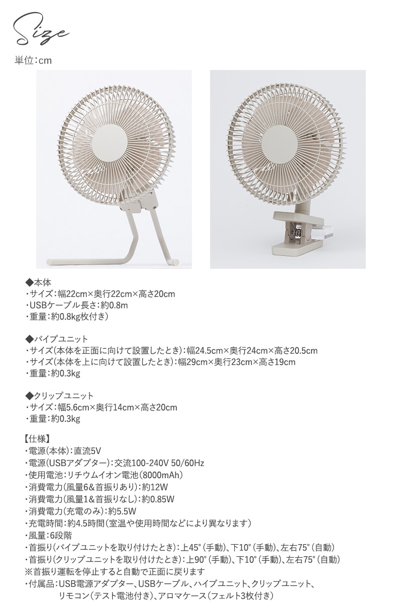 | 特徴 | ・アウトドアでも使えるコードレス扇風機 アウトドアでも暮らしの中でも、快適な風をいつも身近に。防塵・防滴・コードレスにより、キャンプなどのアウトドアで活躍するコンパクト扇風機です。スマホを充電するモバイルバッテリーとしても機能するので、防災アイテムとしても重宝します。 ・手軽に持ち運べるコンパクトサイズ 子どもでも片手で持てるコンパクトサイズ。運動会、キャンプ、バーベキューなど、多彩なシーンに気軽に持ち出せます。 ・砂ぼこりや雨にも強いタフな仕様 アウトドアでも安心の防塵・防滴仕様です。天候が変わりやすいキャンプやバーベキュー中に、急な雨や砂ぼこりに見舞われてもお使いいただけます。 ・使える場所が広がるアタッチメント 置いて使える「パイプユニット」と、ポールなどに挟んで取り付けられる「クリップユニット」の2種類のアタッチメントが付属します。脱衣所、車内、テントの中など、いろいろな場所でお使いいただけます。 ・防災アイテムとしても活躍 USBケーブルがあれば扇風機の電池からスマホへ充電できるので、緊急時はモバイルバッテリーとしても活躍。停電でエアコンが止まってしまっても、満充電状態なら最大30時間は扇風機として使えます。防災アイテムとして、あると何かと安心な1台です。 ・虫よけにも使えるアロマケース付き 本体に取り付けて使えるアロマケースが付属。中のフェルトにアロマオイルを染み込ませれば、芳香・虫よけ・涼感など、シチュエーションやお好みに合わせた機能をプラスできます。 ・失くしにくいカラビナ付きリモコン 離れた場所から操作できるリモコンにはカラビナが付いているので、本体に取り付けることが可能です。本体と一緒に持ち運ぶことができ、紛失しにくいのも嬉しいポイントです。 ・繊細な6段階の風量調節 やさしく静かな微風からパワフルな強風まで、シチュエーションに合わせて6段階から風量をお選びいただけます。 ・お子さまも安心の安全設計 ガードはお子さまの指が入りにくいよう、隙間を狭く設計。チャイルドロック機能も付いているの、お子さまがいるご家庭でも安心してお使いいただけます。 ◆仕様 ・電源(本体):直流5V ・電源(USBアダプター):交流100-240V 50/60Hz ・使用電池:リチウムイオン電池(8000mAh) ・消費電力(風量6&首振りあり):約12W ・消費電力(風量1&首振りなし):約0.85W ・消費電力(充電のみ):約5.5W ・充電時間:約4.5時間(室温や使用時間などにより異なります) ・風量:6段階 ・首振り(パイプユニットを取り付けたとき):上45°(手動)、下10°(手動)、左右75°(自動) ・首振り(クリップユニットを取り付けたとき):上90°(手動)、下10°(手動)、左右75°(自動) ※首振り運転を停止すると自動で正面に戻ります ・付属品:USB電源アダプター、USBケーブル、ハイプユニット、クリップユニット、リモコン(テスト電池付き)、アロマケース(フェルト3枚付き) ◆ブランド siroca(シロカ) 「おいしい」や「心地いい」、そして「うつくしい」。そうした小さな幸せは、あたりまえの日々を豊かに彩る隠し味です。sirocaは、やさしい家電をとおして毎日に寄り添い、喜びのひとときを増やしたいと考えています。ていねいに、こだわって暮らす、みなさまとともに。 |