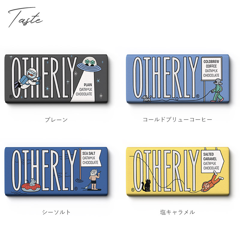 | 特徴 | ・オンリーワンのヴィーガンチョコレート コロンビア産のフィノ・デ・アロマのカカオ豆とオーツミルクを使用したプラントベースのチョコレート。ローストしたカカオの香ばしさとオーツ麦の繊細でビスケットやシリアルを思わせる香りが引き立つ、オンリーワンのヴィーガンチョコレートです。 ・フィノ・デ・アロマのカカオ豆 フィノ・デ・アロマは中南米地域で栽培されるカカオ豆の中でも特に優れた品質をもち、他の一般的なカカオ豆と比較して、芳醇な香り、風味が豊かで苦みが少なく、フルーティーでフローラルな味わいが特徴です。国際ココア機関(ICCO)が定義するファインカカオの中でもフィノ・デ・アロマと呼ばれるカカオ豆は、最高品質のカカオ豆の一つとされています。 ・アートデザインを取り入れたチョコレート アメリカ、ブルックリンを拠点としている韓国出身のイラストレーター、Tomi Umさんが手掛けたパッケージ。彼女の作品は鮮やかでポップな色使いやキュートなタッチのイラストが特徴的で、新聞からタクシーの車内までと、さまざまなところで人々を魅了しています。思わず全てのパッケージを集めたくなるような、アート作品のようなチョコレートです。 ・おしゃれに敏感な方へのギフトに 個性を大切にしたいというメッセージが込められた、魅力的なアートチョコレート。かわいいミニサイズでご自身用はもちろん、食へのこだわりや、おしゃれに敏感な方へのちょっとしたギフトに最適です。 ◆テイスト ・プレーン:カカオの中にビスケットやシリアルを思わせるオーツ麦のクリーミーな味わいが絶妙。 ・コールドブリューコーヒー:カカオとオーツ麦のクリーミーな風味に、ローストしたコーヒーをプラスした大人の味わい。 ・シーソルト:カカオとオーツ麦のクリーミーな風味に、しっかりとした塩味のシーソルトをプラスしたさっぱりとした味わい。 ・塩キャラメル:カカオとオーツ麦のクリーミーな風味に、塩キャラメルの風味をプラスした甘じょっぱい味わい。 ◆ブランド スコットランドから日本初上陸のヴィーガンチョコレートブランド。 OTHERLYというブランド名は「個性を大切に」「オリジナリティを尊重したい」というメッセージを込めて、「OTHERLY WAY」から来ています。ミルクの代わりにオーツミルクを使用し、他との違いを尊重したい。さらに、自己表現の手段として使えるようなパッケージデザインも特徴的です。 コロンビア産のカカオ豆とオーツミルクを使用したプラントベースのチョコレートはローストしたカカオの香ばしさとオーツ麦のビスケットやシリアルを思わせる香りが引き立つ、贅沢でクリーミーなオンリーワンのヴィーガンチョコです。 |