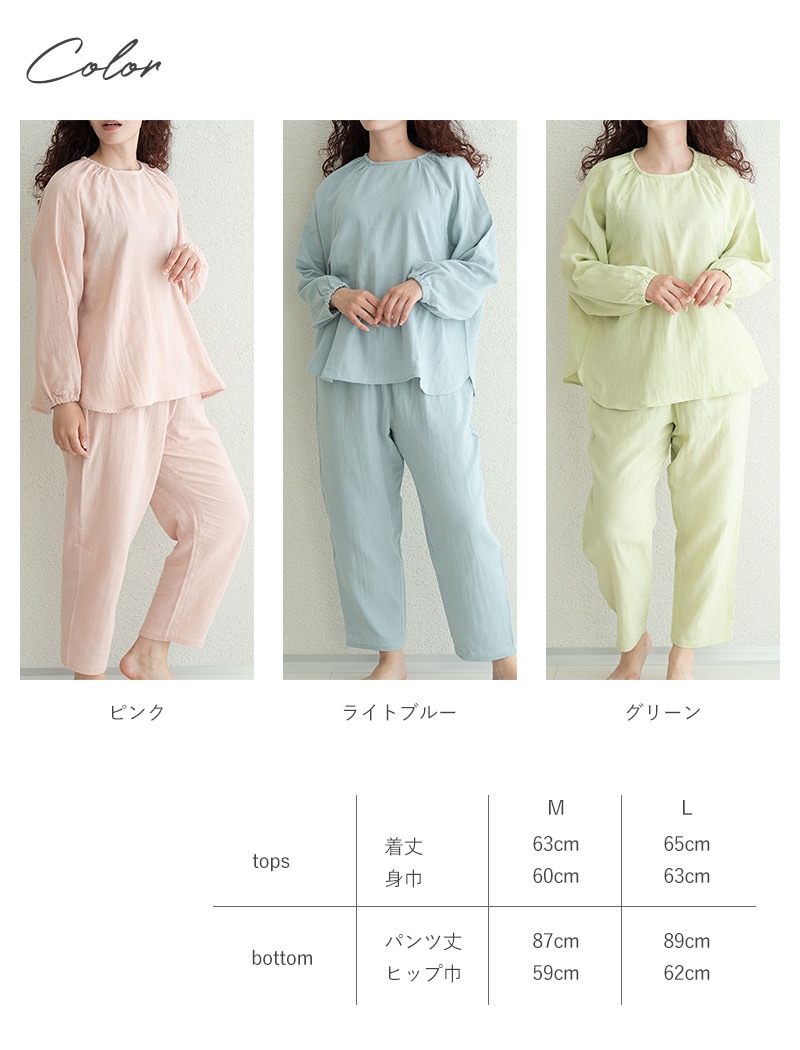 | サイズ | ・M:着丈63cm、身巾60cm、パンツ丈87cm、ヒップ巾59cm ・L:着丈65cm、身巾63cm、パンツ丈89cm、ヒップ巾62cm |
