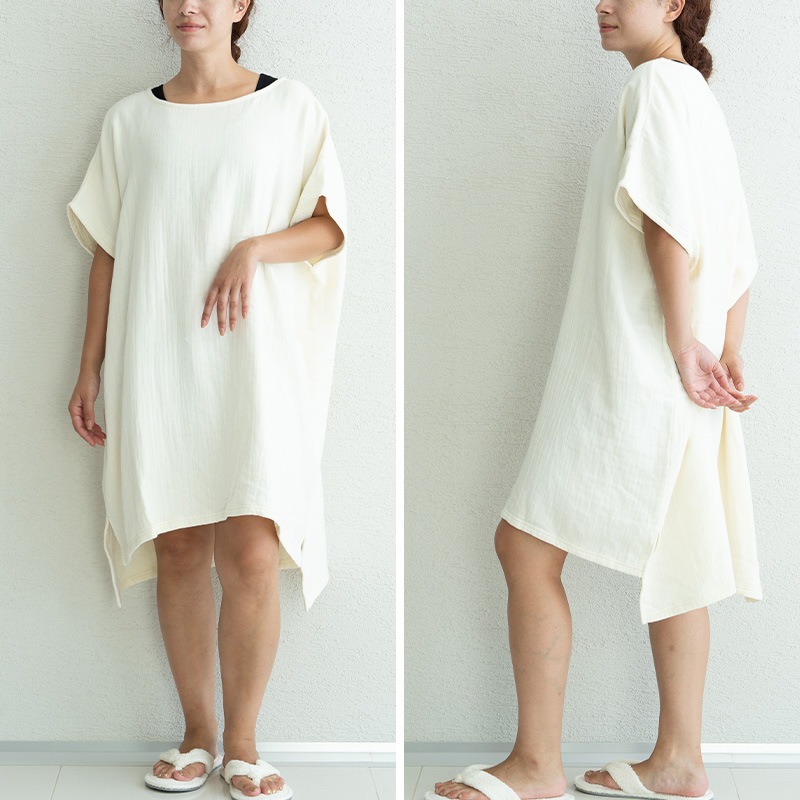 湯冷めとお肌の乾燥から守ってくれる、保湿成分を配合した湯上りワンピース。幅広い年齢の方に着やすいデザインです。