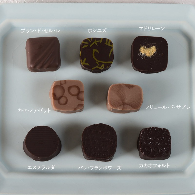 | 原材料名 | カカオ豆、砂糖、ココアバター、バター、クリーム、ヘーゼルナッツ、全粉乳、ブドウ糖シロップ、アーモンド、ウエハース(小麦粉、砂糖、バター、その他)、レモンピューレ、転化糖、ラズベリーピューレ、オレンジピール、オレンジピューレ、はちみつ、ゆず粉末、オレンジ、ラズベリー、食塩、バニラビーンズ、シナモン、ジンジャー/ソルビトール、乳化剤、増粘剤(ペクチン)、着色料(ウコン)、酸味料 ※アレルゲン:小麦、乳、アーモンド、オレンジ ※コンタミ:卵、くるみ |