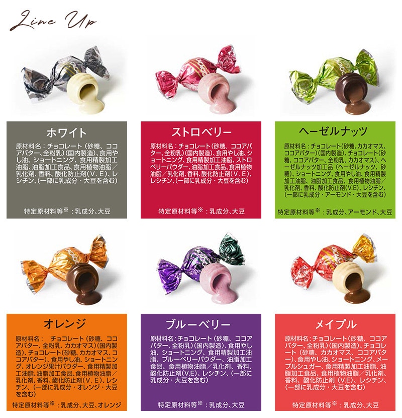 | 内容量 | ホワイト、ストロベリー、ヘーゼルナッツ、オレンジ、ブルーベリー、メイプル×各1個 |