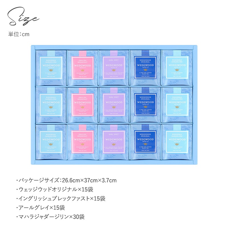 | 内容量 | ウェッジウッド オリジナル ティーバッグ×15袋、イングリッシュ ブレックファスト ティーバッグ×15袋、アールグレイ×15袋、マハラジャ ダージリン×30袋 |