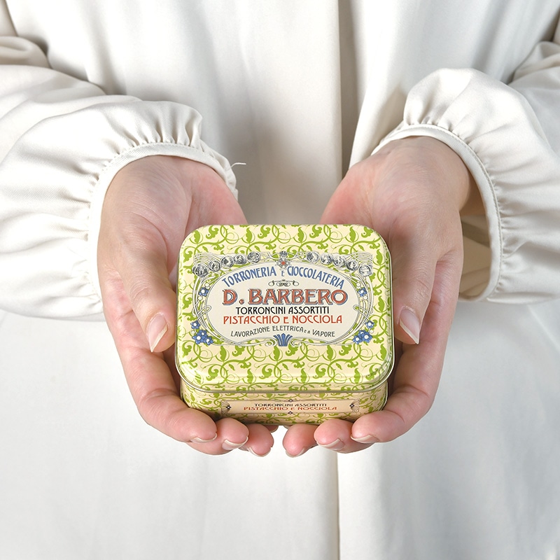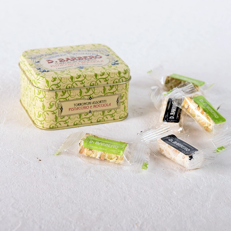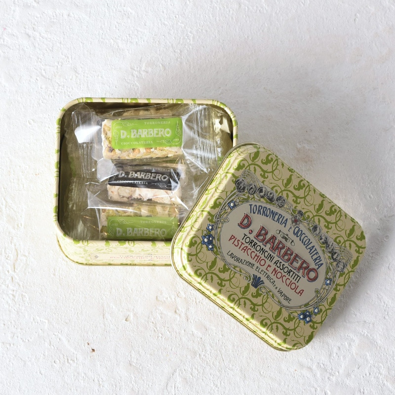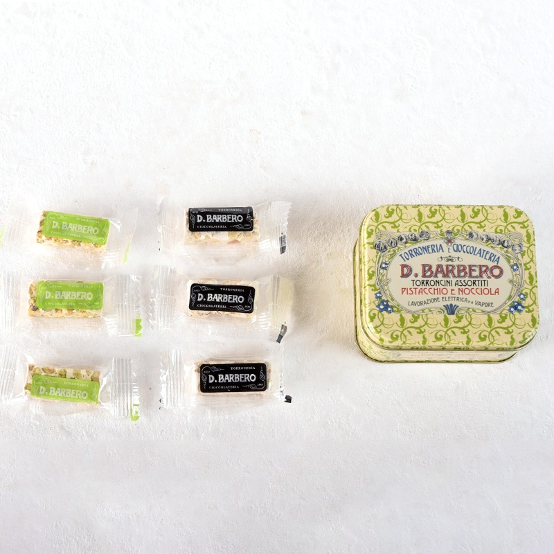 ピエモンテ産IGPヘーゼルナッツを混ぜたハードタイプのトロンチーニと、ピスタチオトロンチーニを贅沢に各3粒ずつアソート。ヌガーとも呼ばれる、北イタリアの伝統的なお菓子で、ナッツの風味がよく香り、クセになる味わいです。
