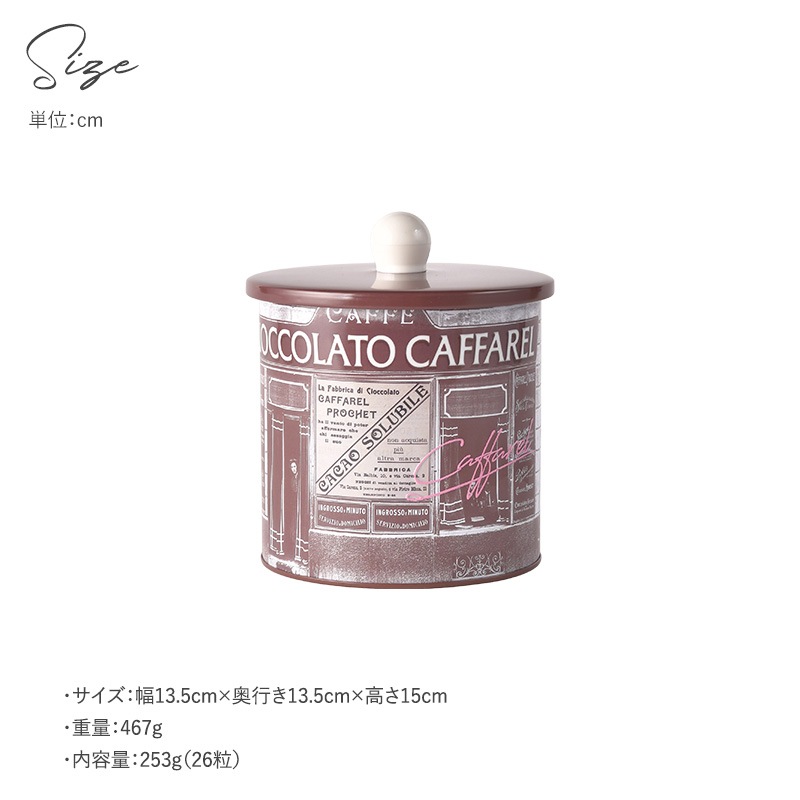 | 特徴 | ・カファレル 200周年記念コレクション 2026年に創業200周年を迎えるCaffarel(カファレル)。従来のかわいらしさではなく、重厚な歴史感じる大人コレクションを展開します。200年の歴史をデザインでお楽しみいただけ、カファレルの代名詞である「ジャンドゥーヤ」をはじめ、26粒の人気商品を贅沢にアソートした、男性へのギフトにもおすすめの逸品です。 ・できたてのような、とろける食感 カファレルは絞り出したチョコが自然に固まるのを待つ「押出成形」という昔ながらの製法を続けており、その食感はまるで今できたばかりのように、ふんわりなめらか。とろけるような舌触りと豊かな余韻が残る濃厚な味わいが、世界中のスイーツ愛好家を魅了しています。 ・小物入れとしても活躍 おいしいチョコレートだけではなく、おしゃれなデザインの缶も大人気。チョコを食べ終わったあとは、蓋付きで小物入れとしても最適。食べ終わった後もずっと楽しさが続きます。 ◆ジャンドゥーヤチョコレートとは ジャンドゥーヤチョコレートはカファレルが世界で初めて発明し、1869年にイタリア王室の御用達になりました。イタリア・ピエモンテ産のヘーゼルナッツペーストを28%も含む、くちどけなめらかで香り豊かなチョコレートです。 ◆製品の注意事項 チョコレートは高温になると油脂分が溶け、冷えると白く固まることがあります。風味のうえでは劣りますが、召し上がっても差し支えありません。 ◆ブランド Caffarel(カファレル) カファレル社は1826年にイタリアのトリノで創立されました。19世紀初頭、当時としてはまったく新しいタイプのチョコレート「ジャンドゥーヤ」を創りだし、以来、そのユニークで香り高くとろけるような舌触りを持つチョコレートは、ヨーロッパ各国のグルメから喝采を浴びつづけています。長い伝統と高い技術によって生み出されている気品ある味と香りは、現在、エレガントな贈り物として世界中の人々に愛されています。 |