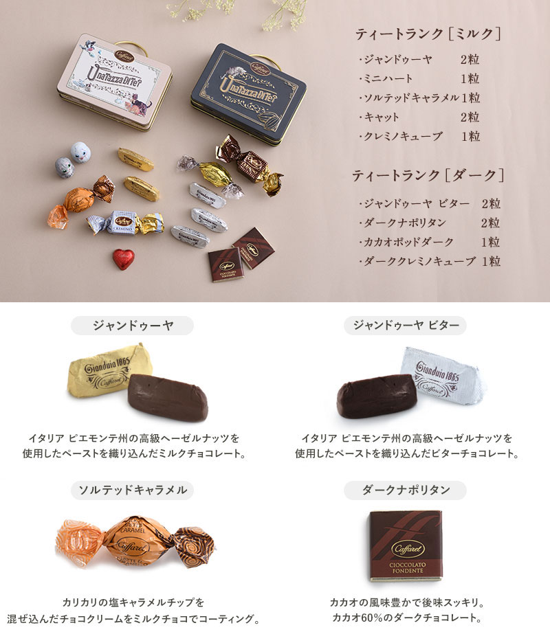 | 内容量 | チョコレート7粒×2缶 ・ミルク:ジャンドゥーヤ×2、ミニハート×1、ソルテッドキャラメル×1、キャットアソート×2、クレミノキューブ×1 ・ダーク:ジャンドゥーヤビター×3、ダークナポリタン×2、ダーククレミノキューブ×1、カカオポットダーク×1 |