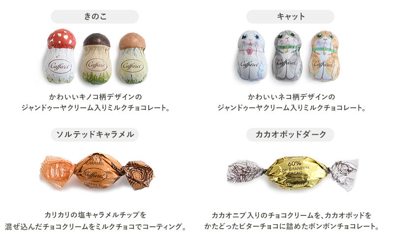 | 内容量 | チョコレート10粒(ピエモンテ×1、カカオポットダーク×1、ジャンドゥーヤ×2、ジャンドゥーヤビター×1、ミニハート×2、ソルテッドキャラメル×1、キャット×1、きのこ×1) |
