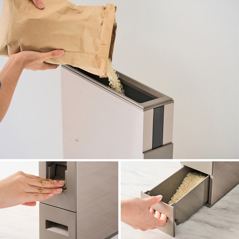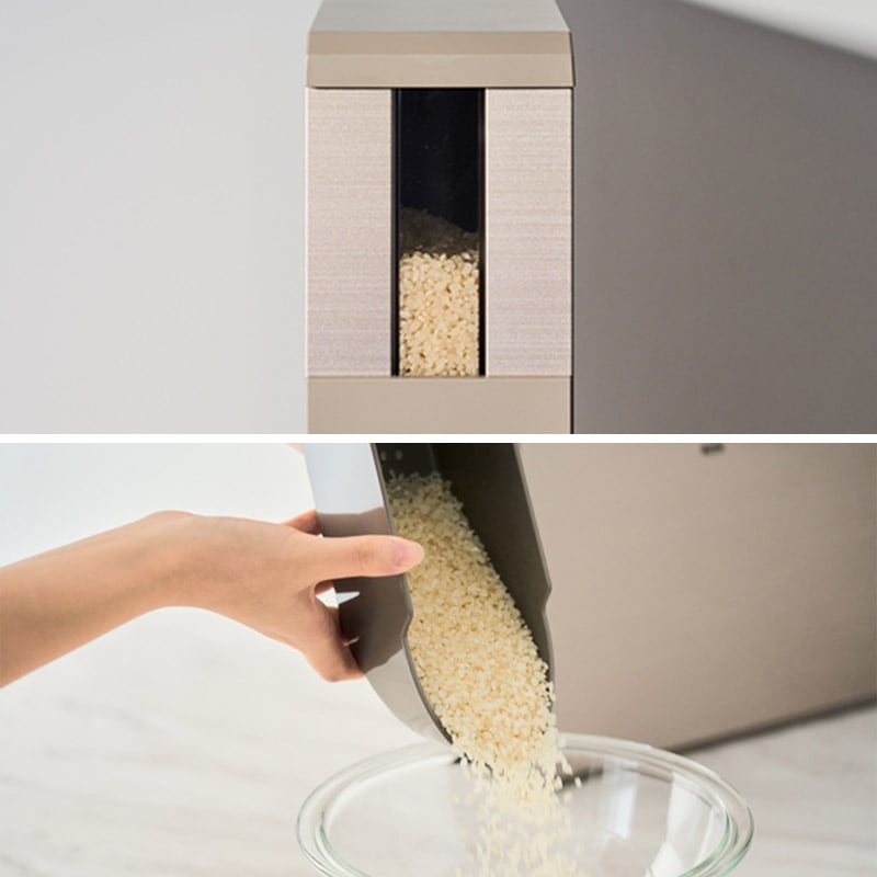 | 特徴 | ・わずかな隙間にピッタリおさまる米びつ キッチンのちょっとした隙間にも収納可能なスリムの米びつ、12kgタイプです。米びつは密閉性が高く、お米の鮮度とおいしさを長期間キープすることが可能です。本体には銅板を使用しシャンパンゴールドカラーに仕上げた、どんなスタイルのキッチンにも馴染む、上質な印象のおしゃれなアイテムです。 ・計量カップがいらないレバー式構造 計量はレバー式で1回押し下げるごとに1合の計量。付属のアタッチメントを装着することで0.5合計量への変更も可能です。下部の米受けには最大4合まで入るので、一人暮らしから大家族まで様々なライフスタイルに対応します。 ・使い勝手のいい設計 炊飯器のお釜や鍋などにお米を入れやすい「舟型」の形状をした米受けや、お米の残量が確認しやすい「窓」が付いているので、使い勝手にも長けています。 ・隙間から引き出すのも簡単 米びつの底面には小さなタイヤが付いているので、一度収納した隙間から引き出すのも簡単です。キッチンのレイアウト変更も気軽にできる嬉しい仕様。 ◆製品の注意事項 ・米ぬかなどで汚れていると虫の発生原因となります。米を追加するときは、先に入れた米が残らないように計量レバーを使って米を出しきり、米びつ内をきれいにしてください。 ・米びつ内に虫が発生した場合は、米びつ内の米をすべて取り出した後、きれいに拭いて天日でよく乾かしてから使用してください。 ・米以外のものが計量部に入ると故障の原因となります。万一異物が入ってしまった場合は、米を全部取り出して確認のうえ、異物を取り除いた後に米を入れなおしてください。 ◆お手入れ方法 ・米びつ内を掃除するときは、通常使用するところ以外に手が触れて怪我の原因となるおそれがありますので手袋を着用してください。 ・台所用中性洗剤(食器用、調理器具用)をご使用ください。 ・米びつ内は洗わず、から拭きしてください。洗うと錆びの原因になることがあります。 ・シンナー、ベンジン、クレンザー、漂白剤、たわし、化学雑巾などは表面を傷つけるので使用しないでください。 ・汚れたら洗剤を薄めた水またはぬるま湯にやわらかい布をひたし、よく絞ってから拭きとってください。 |