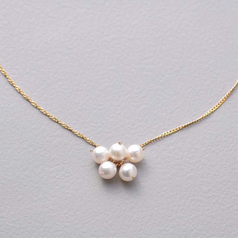 | 特徴 | ・かわいらしいフォルムが魅力 ぽってりとした淡水パールが5つ、かわいらしい梅の花を思わせるフォルムが魅力的なネックレス。淡水パールはあこやパールに比べ、カジュアル使いができるところが嬉しいポイント。ぷっくりとしたパールがお顔まわりを華やかに演出します。 ・後ろ姿も美しい チェーンにはスクリューのかかったデザインを採用。きらりと輝くスクリューチェーンが女性らしさをプラスします。エンドパーツにもパールを1粒あしらっており、後ろ姿のディテールまでも美しくエレガントなデザインです。 ・長く愛用できるネックレス チェーンなどの金具にはK14GFを使用。金メッキよりはるかに厚い層で作られているので、長時間使用しても剥げてくることはほとんどなく、お肌にもやさしいので長くご愛用いただけます。 ・プレゼントにもおすすめ Natullyのロゴが入った白いポーチが付属します。デコルテを華やかに演出してくれるネックレスは、おしゃれにこだわりを持つ方や、特別なプレゼントにもおすすめ。 ◆仕様 保証期間:半年間 付属品:ブランドロゴ入りポーチ(白) ◆製品の注意事項 淡水パールは形や輝きについて個体差がございます。天然素材のため、あらかじめご了承ください。 ◆ブランド Natully(ナチュリー) natural(自然に)と、beauty(美しさ)から生まれた造語。本物の輝きと自然の美しさを追求し、天然石やパール、シェルといった素材を吟味。そこに洗練された技術と手作りのあたたかさをプラスしたアクセサリーを創りだすブランドです。 |