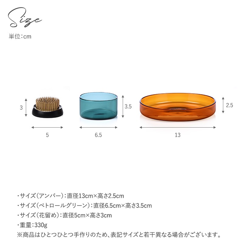 | サイズ/重量 | ・サイズ(アンバー):直径13cm×高さ2.5cm ・サイズ(ペトロールグリーン):直径6.5cm×高さ3.5cm ・サイズ(花留め):直径5cm×高さ3cm ・重量:330g ※商品はひとつひとつ手作りのため、表記サイズと若干異なる場合がございます。 |