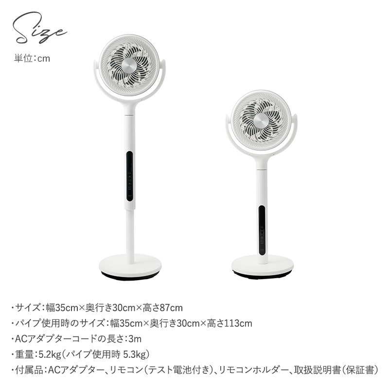 | サイズ/重量 | ・サイズ:幅35cm×奥行き30cm×高さ87cm ・パイプ使用時のサイズ:幅35cm×奥行き30cm×高さ113cm ・ACアダプターコードの長さ:3m ・重量:5.2kg(パイプ使用時 5.3kg) |