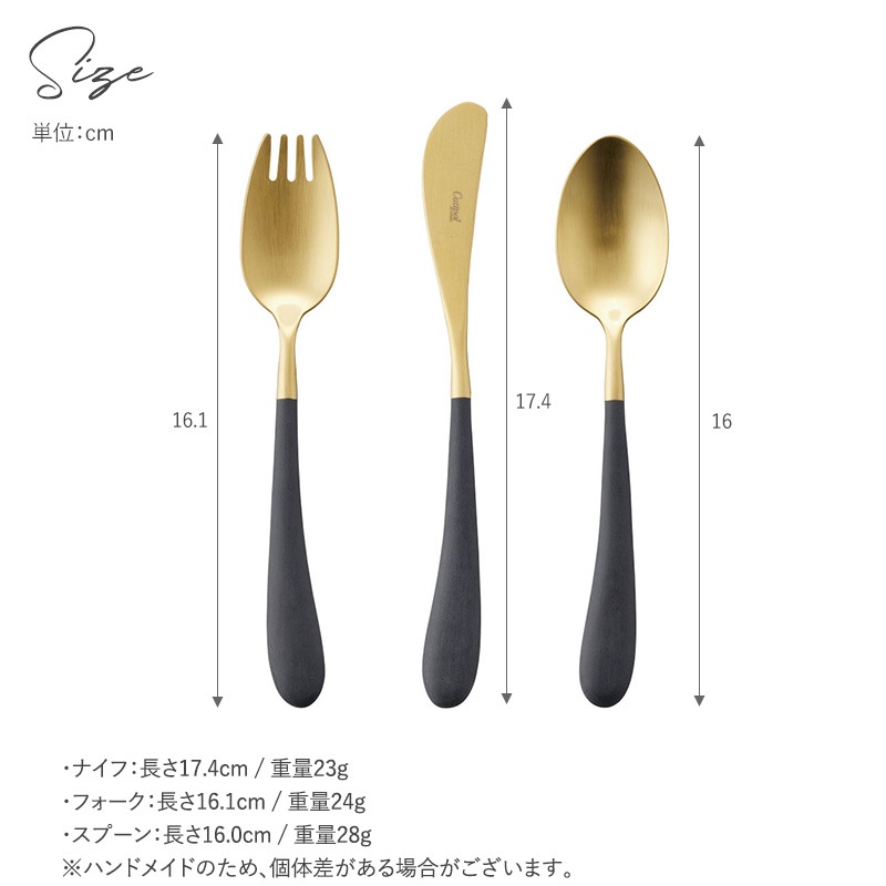 | サイズ/重量 | ・ナイフ:長さ17.4cm / 重量23g ・フォーク:長さ16.1cm / 重量24g ・スプーン:長さ16.0cm / 重量28g ※ハンドメイドのため、個体差がある場合がございます。 |