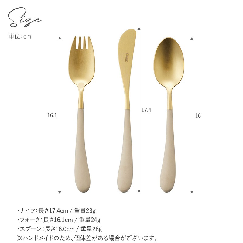| サイズ/重量 | ・ナイフ:長さ17.4cm / 重量23g ・フォーク:長さ16.1cm / 重量24g ・スプーン:長さ16.0cm / 重量28g ※ハンドメイドのため、個体差がある場合がございます。 |