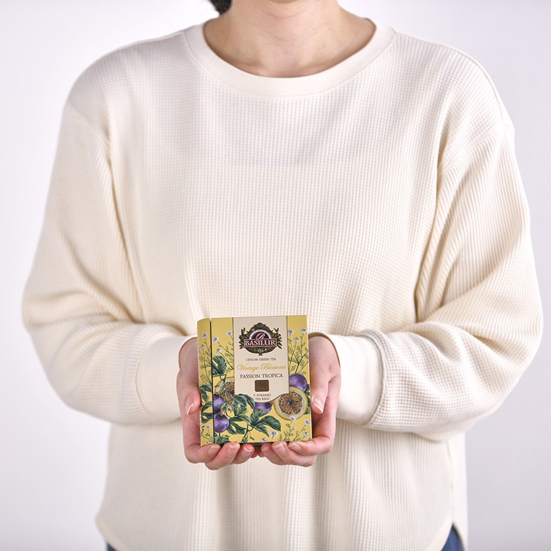 | 特徴 | ・大切な方へのプレゼントに まるで小説を開くかのようにブック缶を開けば、香り豊かな緑茶の世界が広がります。缶中身の細部にまでこだわったデザインで、大切な方への気持ちのこもったプレゼントや自分へのご褒美にもおすすめ。 ・風味と香りが存分に楽しめる 大きな茶葉をそのままいかしたテトラティーバッグ。ピュア セイロン緑茶葉、カモミールの花、天然のパッションフルーツの風味のおいしいコンビネーションで、一口飲むごとにトロピカルな世界がお楽しみいただけます。ホットでもアイスティーとしても、ハチミツを少し加えて楽しめる爽やかなフレーバーティーです。 ・思わず飾りたくなるパッケージ 鮮度や茶葉へのこだわりはもちろん、パッケージデザインにも徹底的にこだわっているバシラーティー。パッケージこそ、洗練された茶葉をお届けするに相応しいデザインが求められると考えており、ヨーロッパ専属デザイナーの演出する、個性溢れるユニークで気品漂うデザインは、皆さまにいつもとは少し違ったティータイムをご提案します。 ・簡単に手間なく、ほっと一息 テトラティーバッグなので、煮出す手間なく気軽にお召し上がりいただけます。忙しい日常には嬉しい手軽さで、ほっと一息、厳選された上質の茶葉が素敵なリラックスタイムへと導きます。 ◆ブランド BASILUR TEA(バシラーティー) 歴史あるセイロンティー原産国スリランカの紅茶ブランド。 広大で自然豊かなスリランカの大地で丁寧に栽培された茶葉は、上質な香りと深い味わいをもち、皆さまの特別な時間を上品に彩ることをお約束します。 |